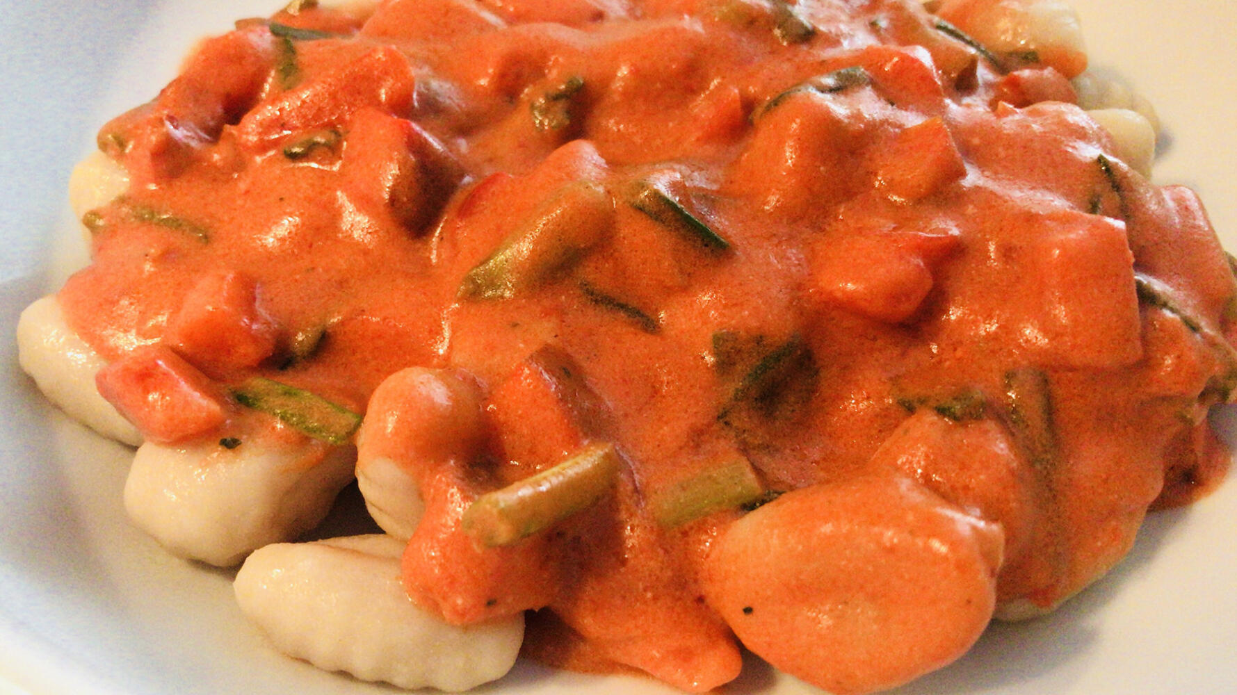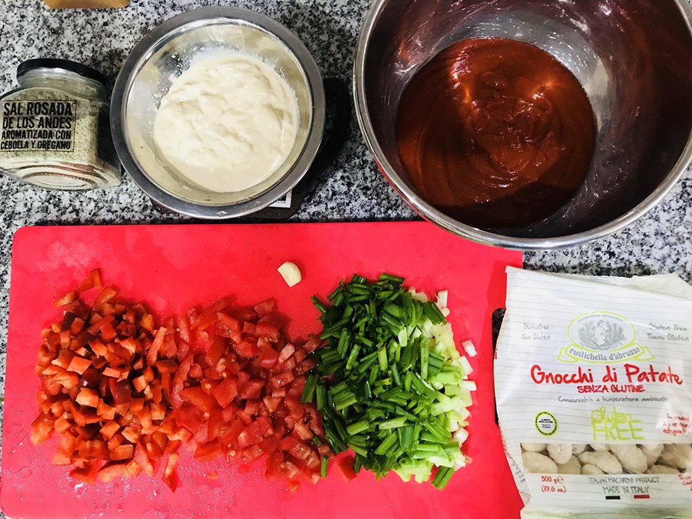 Sumar los pimientos y tomates picados en cuadrados, remover 2 minutos y al final agregar la cebollita china para que no se recocine y quede crunchy. Colocar en un plato los gnocchis y agregar la salsa y a gusto el queso parmesano.